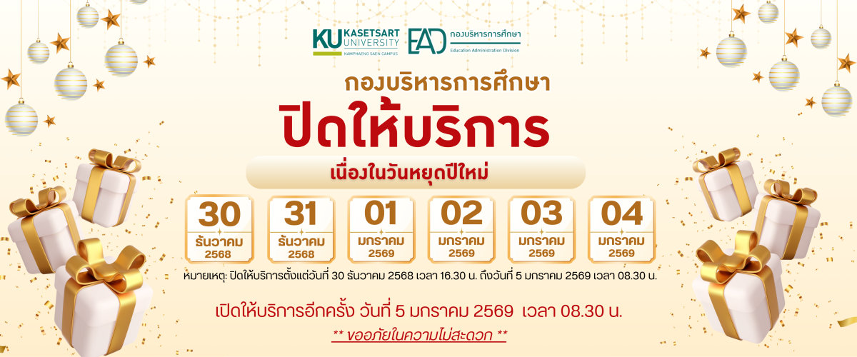 ประกาศกองบริหารการศึกษา มหาวิทยาลัยเกษตรศาสตร์ วิทยาเขตกำแพงแสน เรื่อง ปิดให้บริการเนื่องในวันหยุดเทศกาลปีใหม่